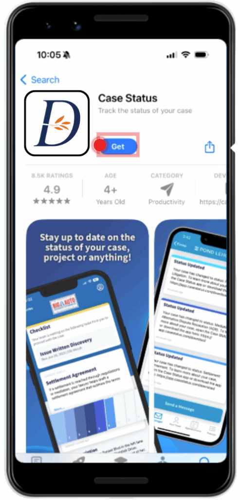 Case Status is a free app you can download to your phone. It gives you real-time notifications and updates on your case—plus an easy way to message your attorney and legal team directly.